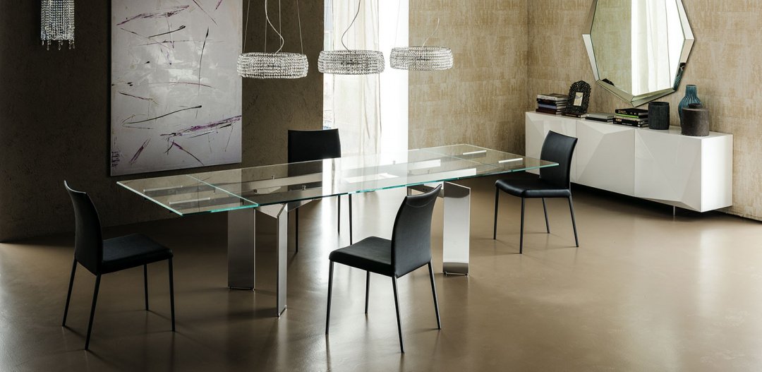 Раздвижной стол с ножками в глянцевой/сатинированной нержавеющей стали, или стали, окрашенной в гофрированный белый (GFM71), графитовый цвет (GFM69), либо покрытые глянцевой/сатинированной нержавеющей сталью с элементами, окрашенными в гофрированный графит (GFM69), белый (GFM71)или черный (GFM73). Топ и раздвижные элементы в прозрачном или сверхпрозрачном стекле толщиной 12 мм. Столешница лежит на базе.