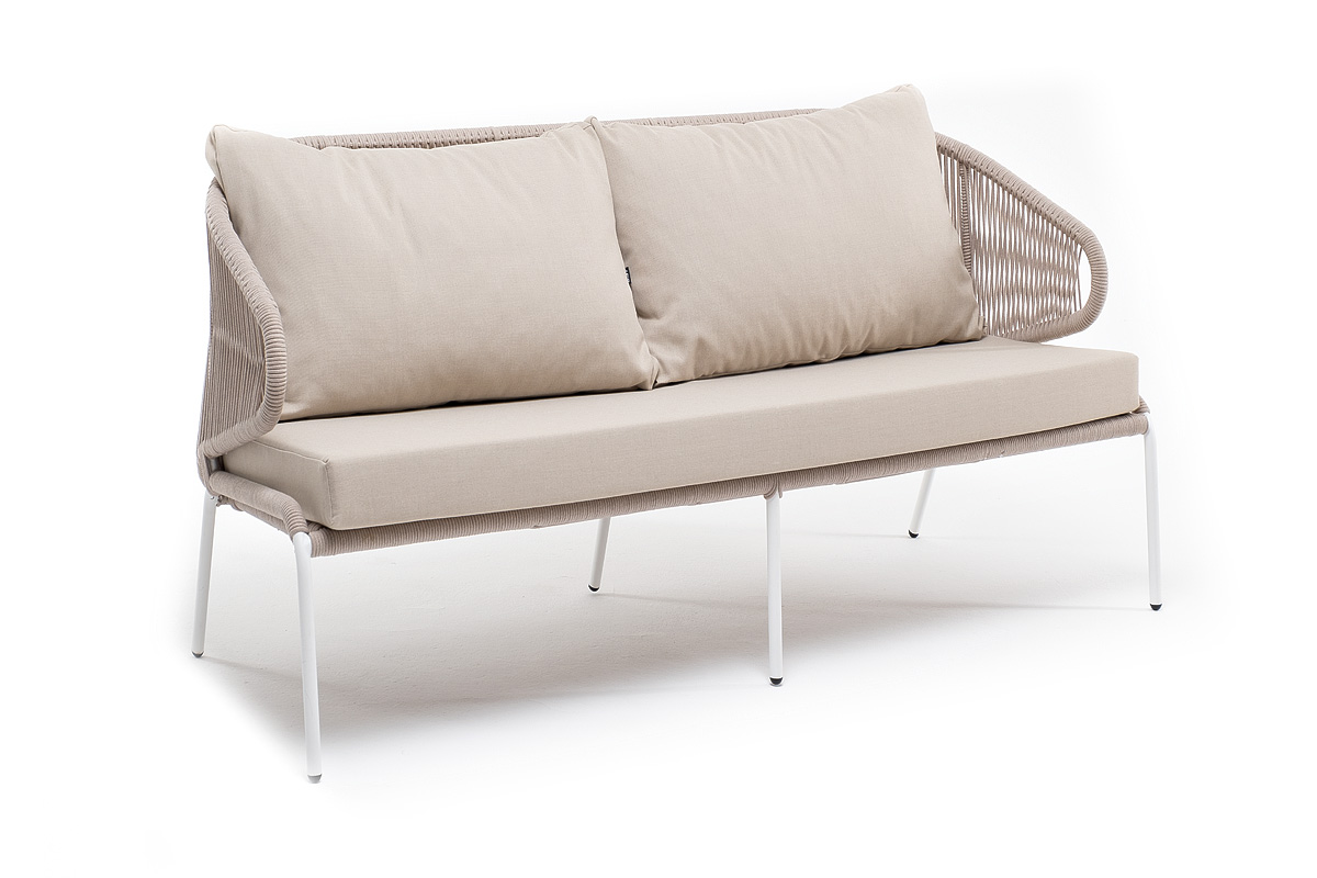 "Милан" диван 2-местный плетеный из роупа, каркас алюминий белый муар, роуп бежевый круглый, ткань бежевая 035