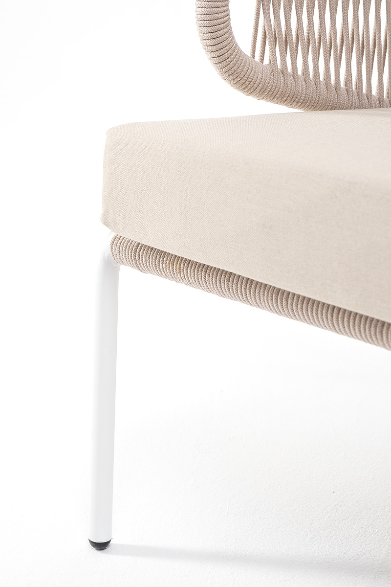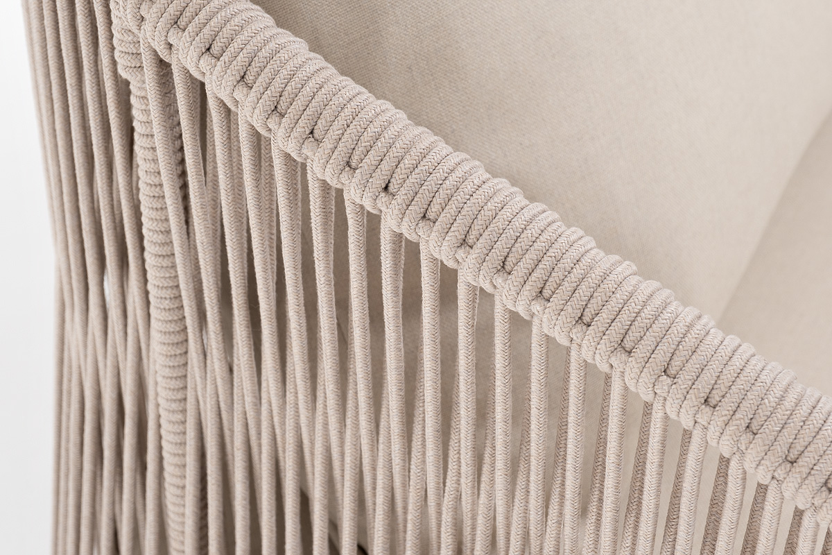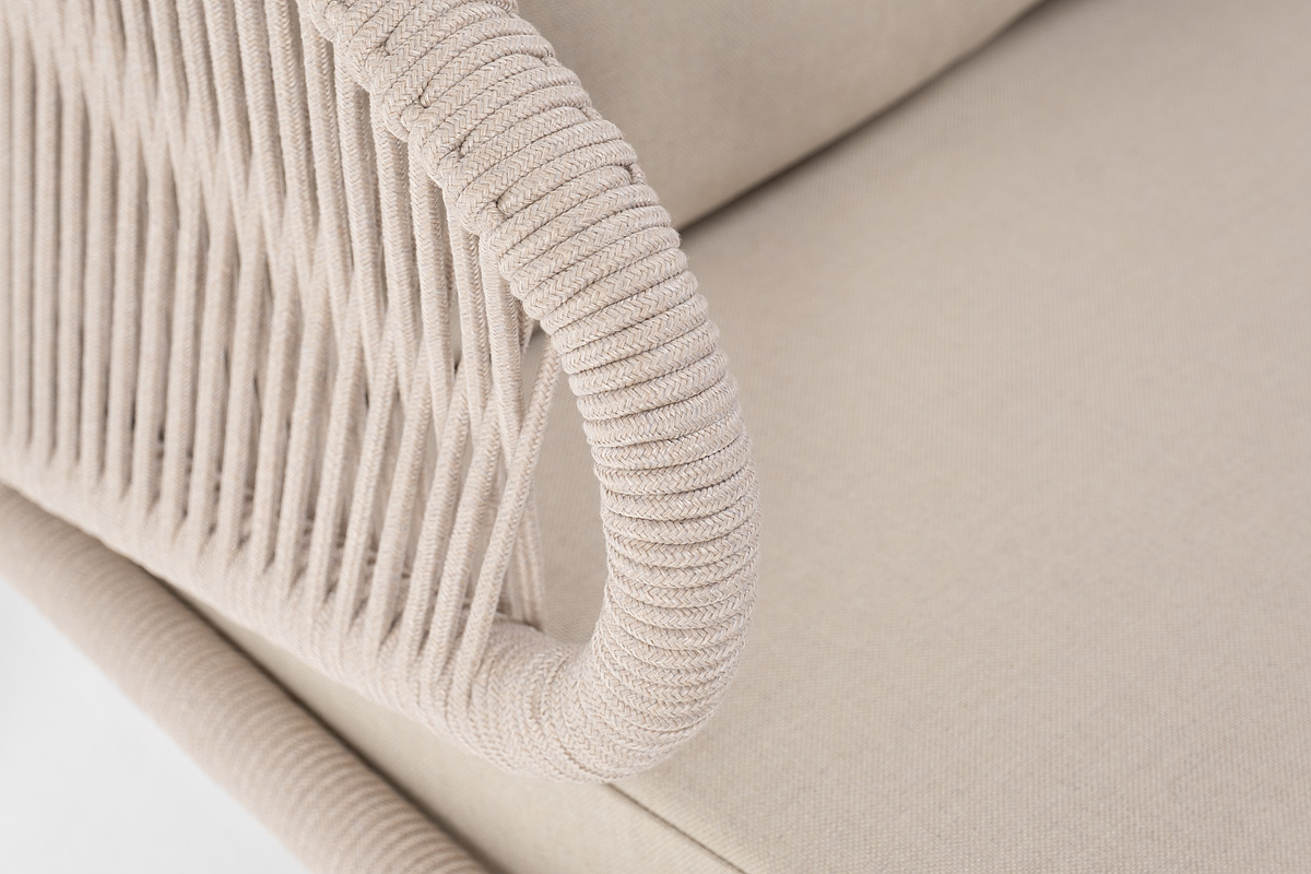 Диван имеет алюминиевый каркас, окрашенный порошковой краской в белый цвет. Боковины каркаса и спинка вручную оплетены роупом - эластичными синтетическими лентами, изготовленными из высокопрочных полиэфирных волокон. Цвет оплетки – бежевый.