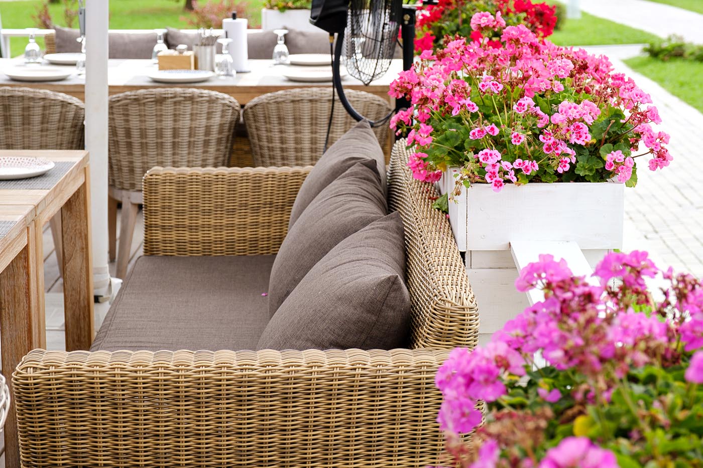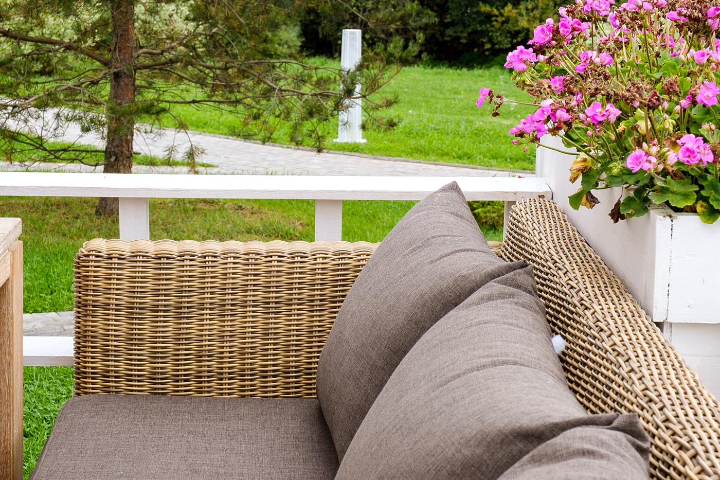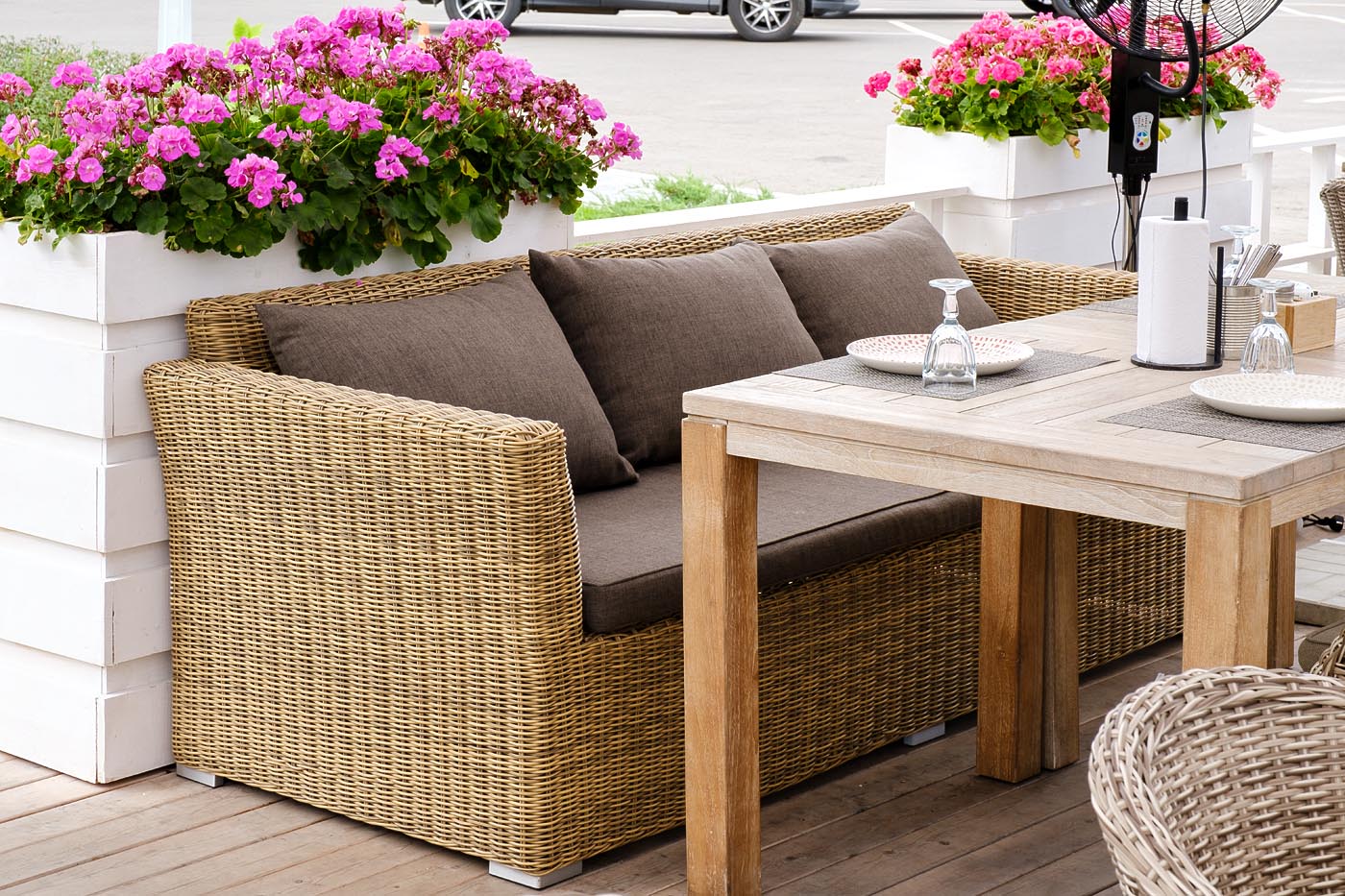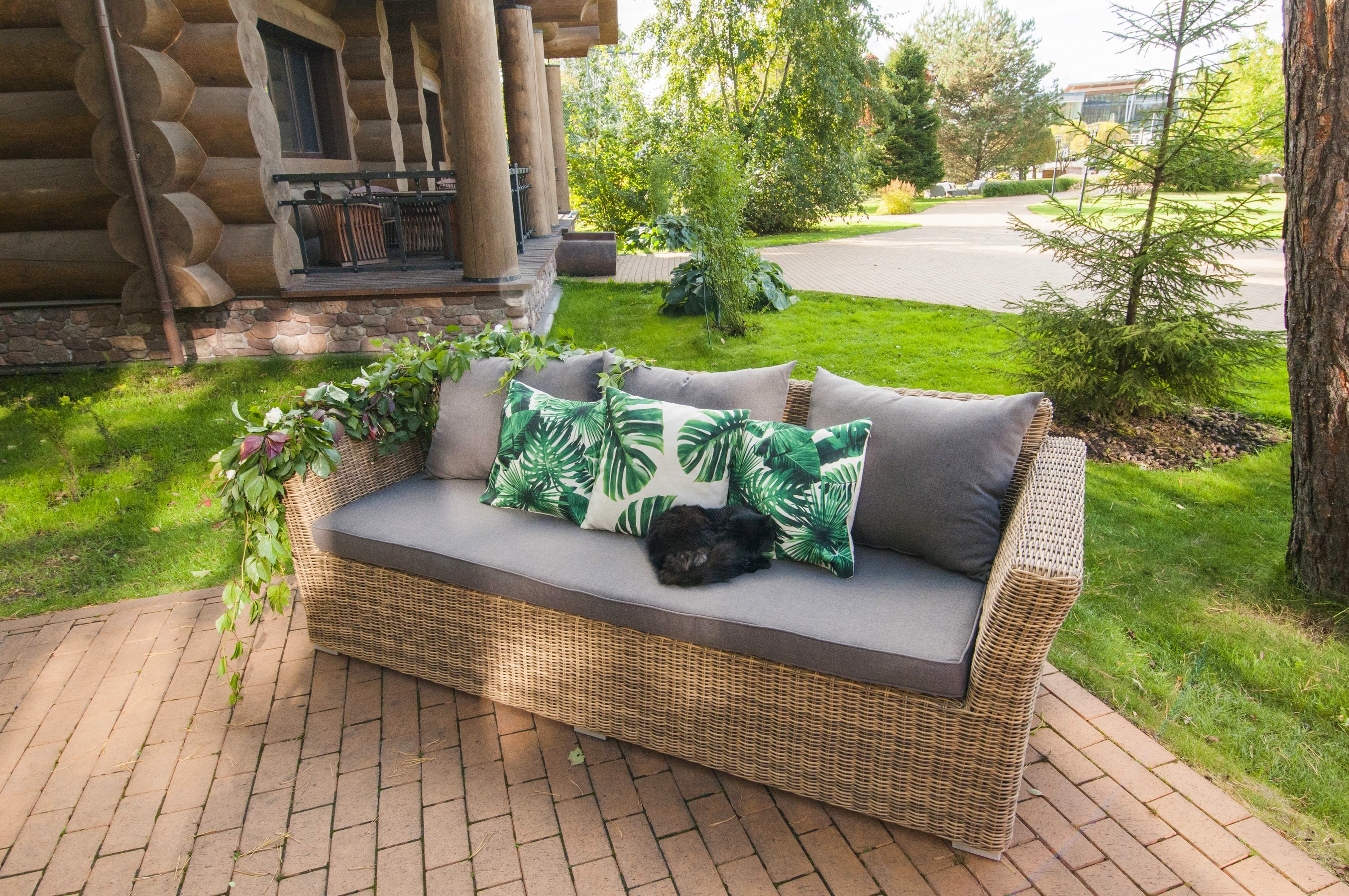 Мебель декорирована ручным круглым плетением, выполненным из искусственного ротанга соломенного цвета.