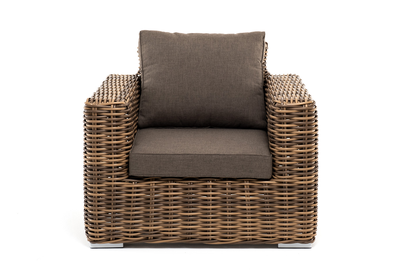 Кресло оснащено каркасом из прочного алюминия, ручное круглое плетение является основным декоративным элементом мебели. Оно выполнено из искусственного ротанга в соломенном цвете.