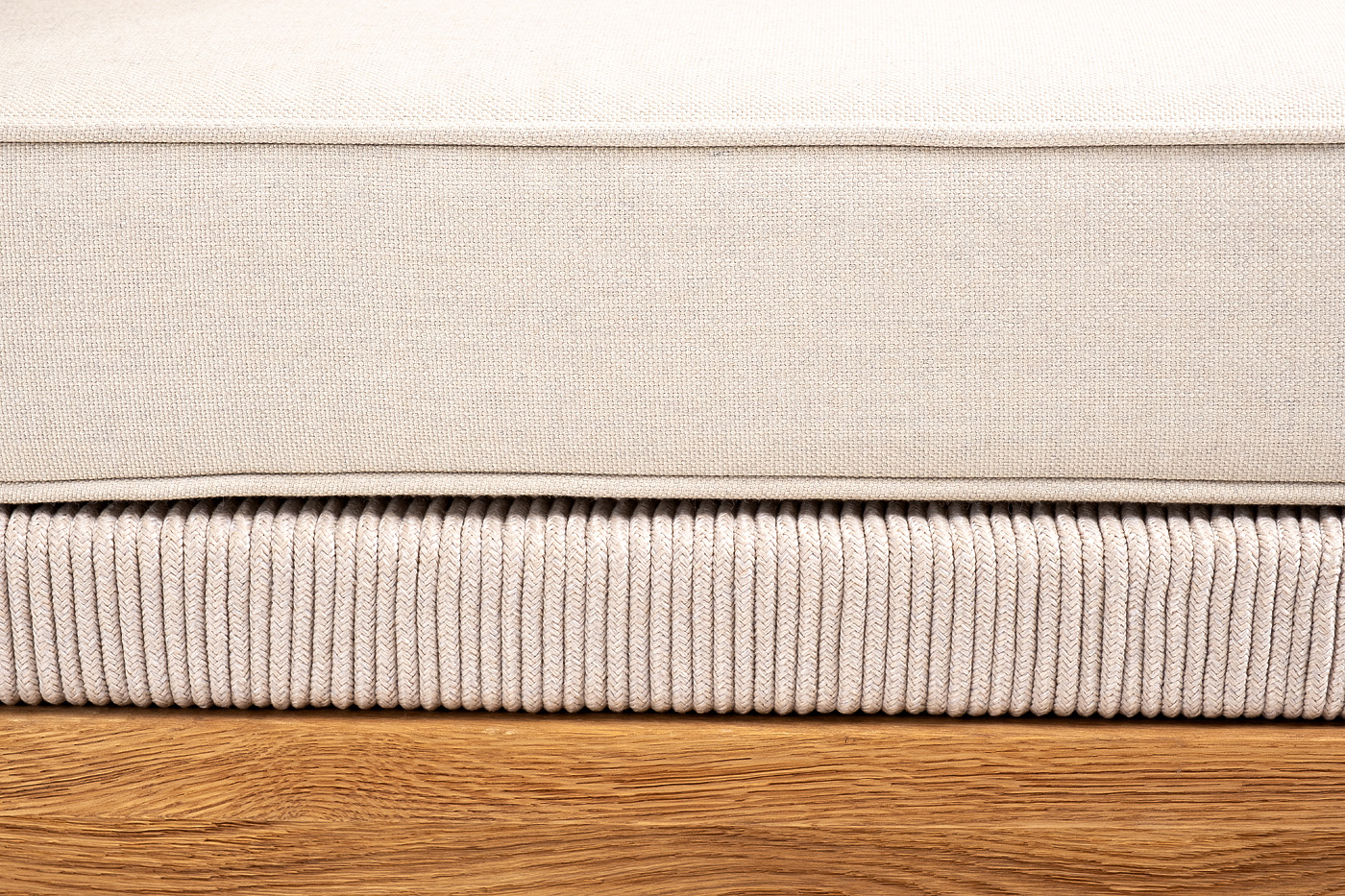 Боковины каркаса вручную оплетены роупом - эластичными синтетическими лентами, изготовленными из высокопрочных полиэфирных волокон. Цвет оплетки - бежевый. Основание дуб.