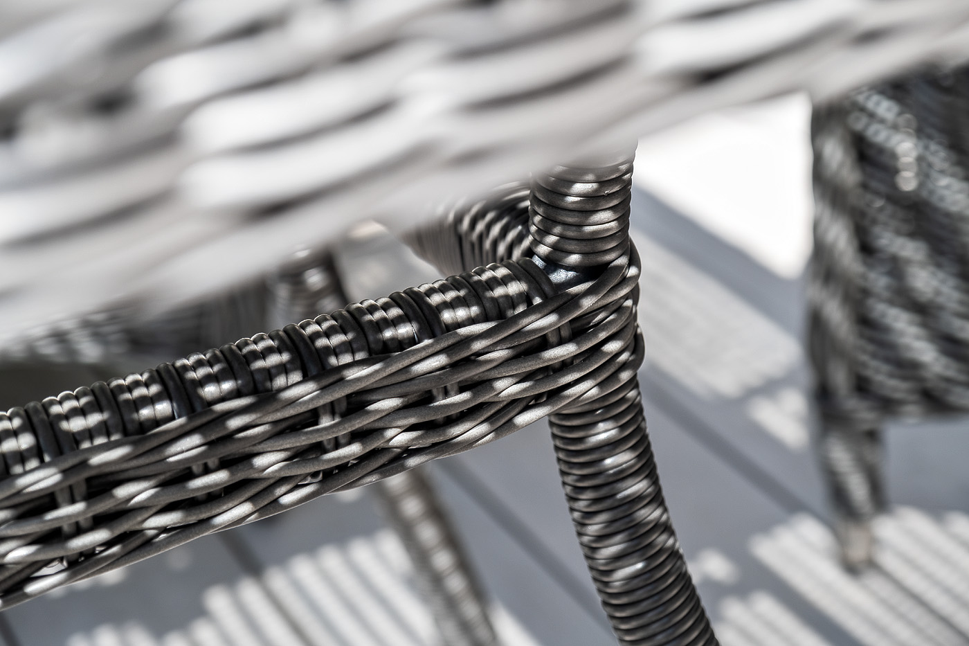Благодаря столешнице из ударопрочного стекла толщиной 5 мм, можно не опасаясь ставить горячую посуду. Каркас изготовлен из прочного алюминия, оплетенного ротангом графитового цвета.